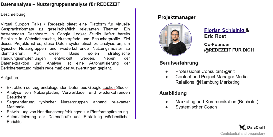Ich bringe langjährige Erfahrung in der persönlichen Assistenz mit – geprägt von Verantwortungsbewusstsein, Kommunikationsstärke und Organisationstalent. Durch meine Weiterbildung zum Data Analyst verbinde ich diese Soft Skills mit analytischem Denken und technischem Know-how. Ich arbeite selbstständig, strukturiert und lerne schnell neue Tools. Meine Empathie hilft mir, komplexe Daten verständlich aufzubereiten und in stressigen Situationen den Überblick zu behalten. Ich suche eine Position als analytischer Teamplayer in einem innovativen Umfeld mit Entwicklungspotenzial.